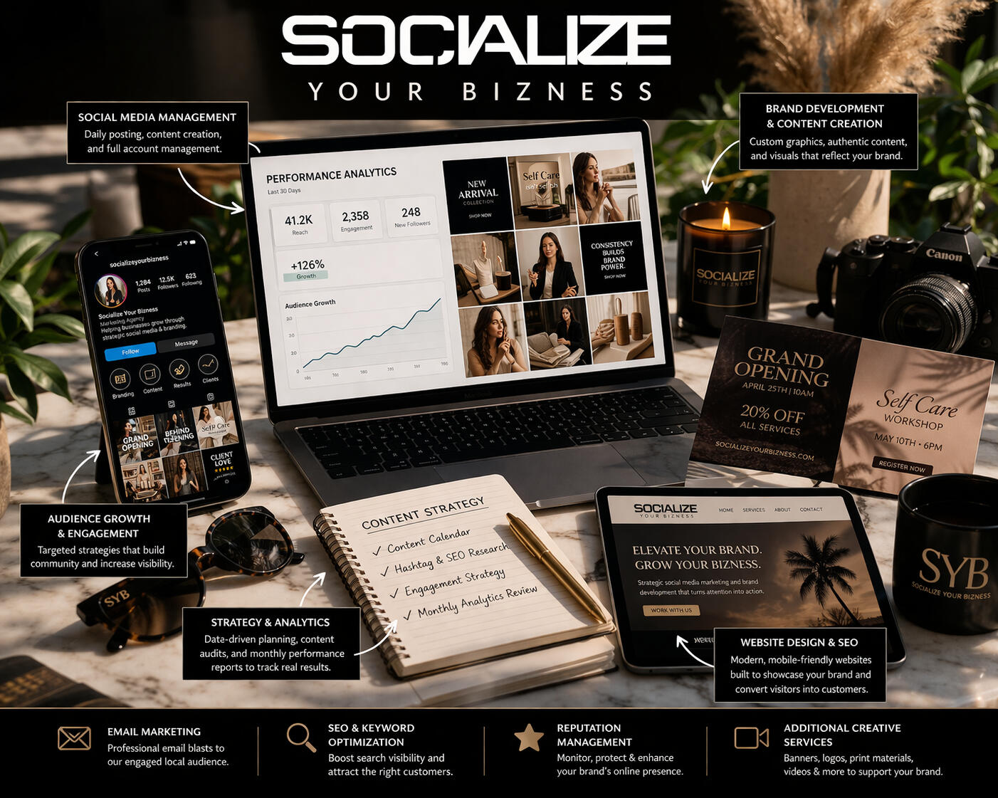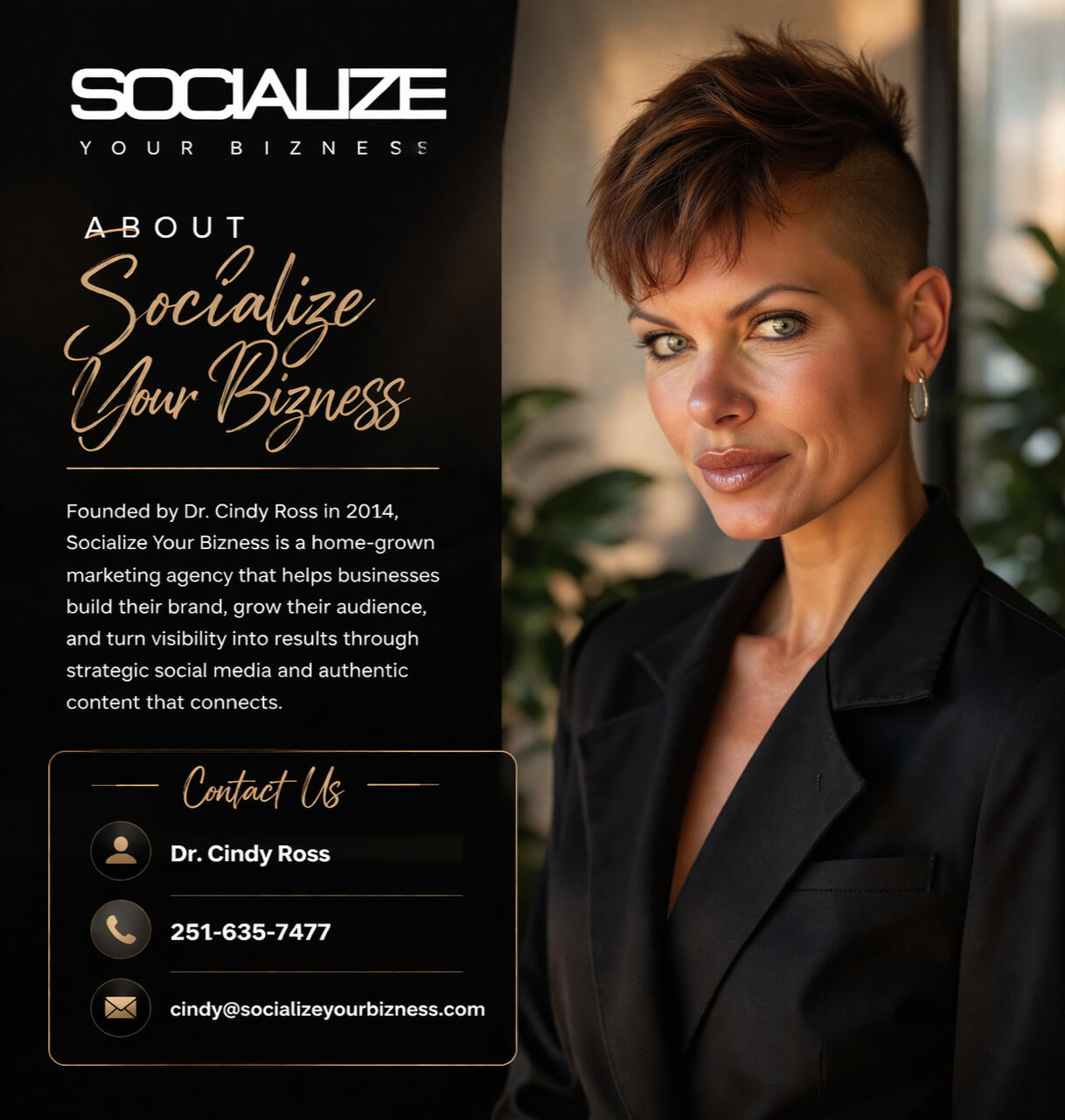 Socialize Your Bizness(SYB) is a home-grown advertising agency, established by Cindy Ross in Mobile, Alabama in 2014. We’re a full-service agency specializing in brand development through social media marketing.